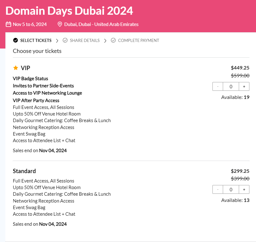 6. Greetings from Domain Days Dubai! The 25% Advance ticket sales are ending in one week, act fast to secure your spot today! Important Deadlines: Discounted Event Tickets Sale Ends on 30/September/2024 Discounted Venue Hotel Room Discount Ends on 5/October/2024 This is the FINAL CALL! 2024 Venue and Rooms We welcome you to the luxurious Marriott Resort, The Palm, Dubai, UAE, for the second annual Domain Days Dubai 2024, this November 5th and 6th! Itโ€™s your oasis in the domain desert! 2024 Sponsors and Partners We are thankful to all the partners & sponsors that are supporting us in making this event a success. Become a Partner Final Sponsorships: Now Available Many of the spots are gone already (as expected), but there are still prime opportunities available. This is your invite to join top domain experts, where every interaction could lead to new trails and treasures. Sponsorship Packages Together, letโ€™s navigate the sands of change and discover the future of the domain industry! Best Regards, Team Domain Days North America Contact: Jason Nickerson Schedule a meeting +1 813-956-1988 MENA Contact: Munir Badr Schedule a meeting +971 55 711 7710