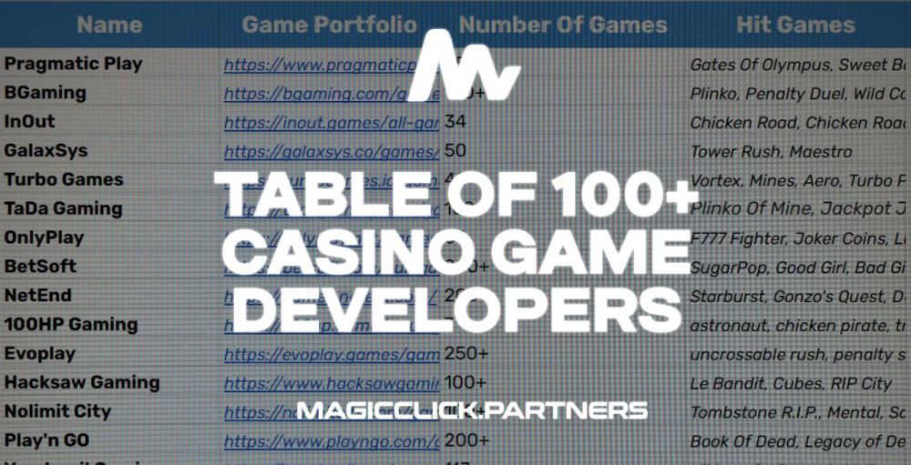 Magic Click Partners replied to Magic Click Partners's topic in Affiliate Networks [Reviews & Updates]🪧 Table of 100+ iGaming Providers We have prepared a handy table for you that gathers over 100 game providers with direct links to their official catalogs. So you can always stay up-to-date with the latest releases and new games from each developer 👇 ➡️ THE TABLE Are you a developer? Contact us, and we'll add you to the list. #table | Magic Click Partners