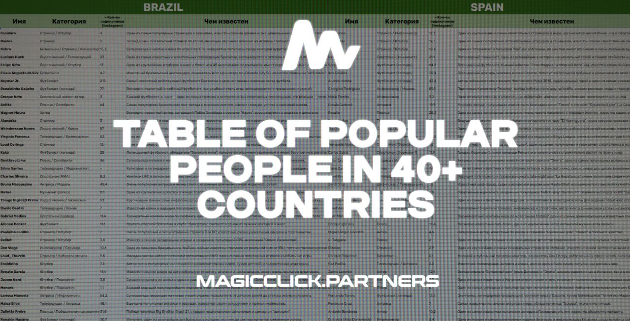 Magic Click Partners replied to Magic Click Partners's topic in Affiliate Networks [Reviews & Updates]🪧 Table of popular people by country We've compiled a table of over 1,500 popular personalities and influencers from 40+ countries for your ad creatives. In this table, you'll find opinion leaders from various countries and categories: athletes, bloggers, streamers, actors, business people, and more. Find your GEO and get to work on a test creative 👇 ➡️ TABLE Not all personalities are included; you can save the table and add your own. The number of subscribers is approximate. By the way, we've hidden $50 here. Be the first to find it and send a screenshot in the comments to the post 🤫 #table | Magic Click | Ask a question