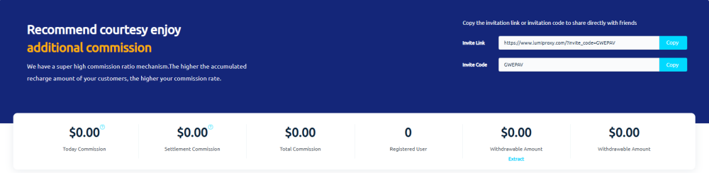 Invite friends to get commissions. All orders can get commissions! Register an account: https://www.lumiproxy.com/?invite_code=GWEPAV ——After creating an account, you can immediately get the invitation code and invitation link. ——Support sharing to personal friends or community forums. ——After anyone registers and pays through your registration link, you can directly get the commission for their order. ——No limit on the number of people. If you have any questions or needs, please contact directly: telegram: https://t.me/Lumiproxy_1