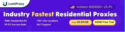 5. Lumiproxy—Free registration and trial, the lowest price in the market! —Covering 195+ countries and regions, more than 90M real residential IP resources. —Various package types for you to choose from, supporting multiple payment methods. —Professional technical support, reliable, timely and patient to help you use it. ►►https://www.lumiproxy.com/ Lumiproxy applicable scenarios: ● ✔ Data capture and web crawling ● ✔ Advertising monitoring and click verification ● ✔ Batch management of social media accounts ● ✔ E-commerce monitoring and price tracking If you have any questions, please contact: [email protected]