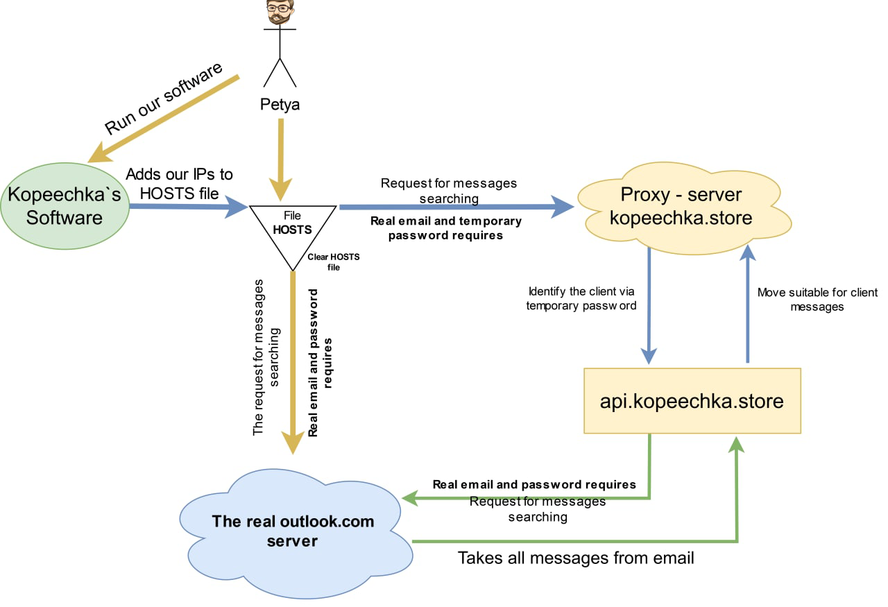 Yellow arrows - user communication with email service (example Outlook.com) without our add-ons;