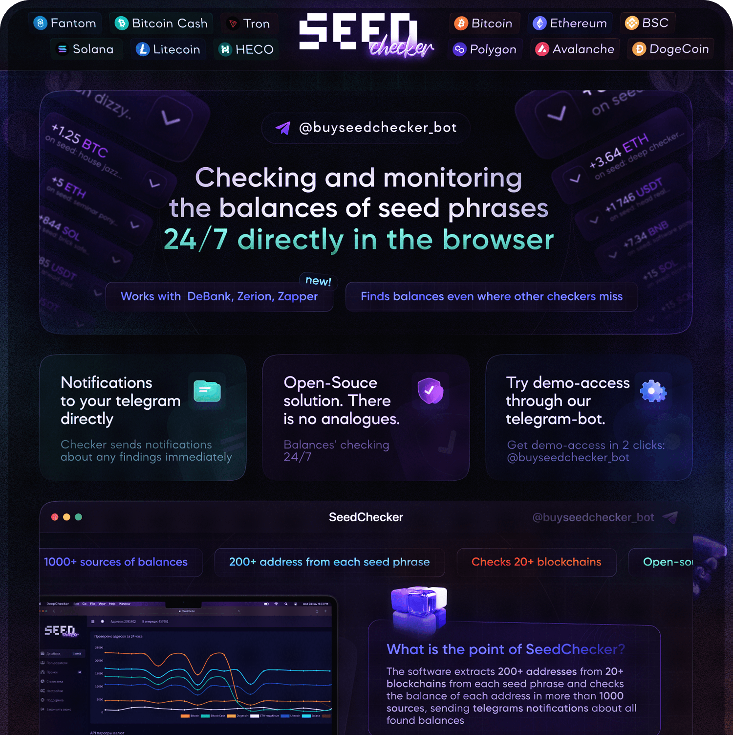 SeedChecker is a browser-based software for checking and 24/7 monitoring of Seed-phrase balances.