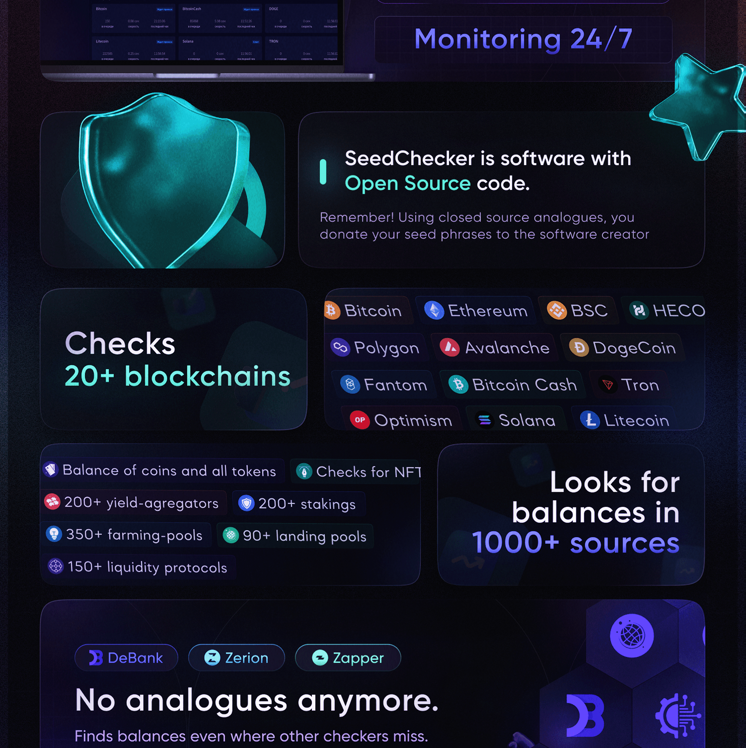Coin balance, balance of all tokens, NFTs, 200+ staking pools, 350+ farming pools, 90+ lending pools, 200+ yield aggregators, 150+ liquidity protocols