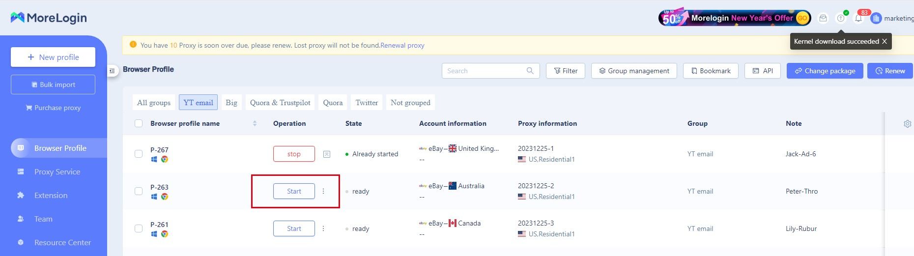 Finally, go back to the “Browser Profile” page and find the browser profile you have just created. Then click "Start" to wake up a new browser window and register your stealth eBay account here.